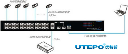 如圖所示:方案中,系統(tǒng)前端采用PoE網(wǎng)絡(luò)高清攝像頭、傳輸端采用優(yōu)特普PoE交換機(jī)UTP7224E-PoE,和后端的顯示器組成整個(gè)監(jiān)控系統(tǒng),該系統(tǒng)有以下特點(diǎn):
