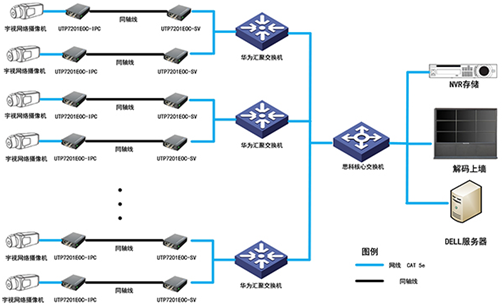 在監(jiān)控系統(tǒng)中,前端攝像機(jī)均采用200W像素的宇視網(wǎng)絡(luò)攝像機(jī),然后通過(guò)優(yōu)特普網(wǎng)電速聯(lián)網(wǎng)絡(luò)延長(zhǎng)器使用同軸線傳輸至每個(gè)子系統(tǒng)的機(jī)房進(jìn)行信號(hào)匯聚,在每個(gè)子系統(tǒng)完成當(dāng)前區(qū)域攝像機(jī)信號(hào)采集后通過(guò)匯聚交換機(jī)傳輸至數(shù)據(jù)中心機(jī)房進(jìn)行信號(hào)處理和上傳。