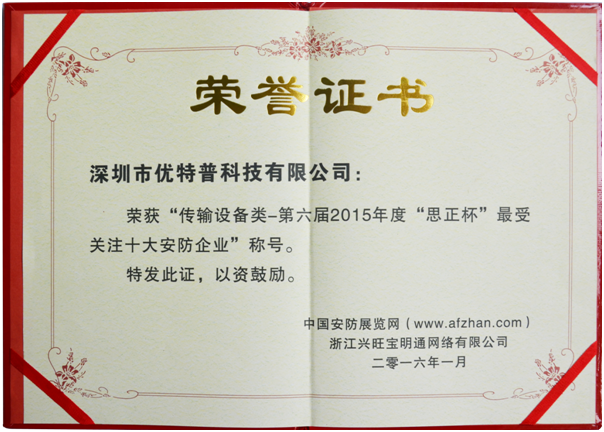 優(yōu)特普深耕安防行業(yè)十多年,始終堅持以“網電速聯匠心造,品質問題零容忍” 的品質觀念經營企業(yè),使企業(yè)綜合實力得到快速發(fā)展。并且在研發(fā)實力、核心技術、創(chuàng)新產品、行業(yè)應用、等方面都具有絕對的競爭優(yōu)勢。一路走來,優(yōu)特普佳績不斷,本次收獲“傳輸設備類最受關注十大安防企業(yè)”稱號,可謂錦上添花。展望未來,優(yōu)特普并不滿足于眼前的成就,力爭在技術與服務的不斷提升,緊緊圍繞著客戶的需求不斷地創(chuàng)新技術、改善服務,以此創(chuàng)造更多優(yōu)質的產品和服務,并不斷引領傳輸設備領域向前發(fā)展。
