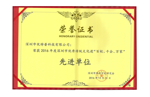 此次獲得“先進(jìn)單位“稱號,是深圳市傳統(tǒng)文化研究會對優(yōu)特普公司2016年在推動傳統(tǒng)文化傳承及創(chuàng)新方面所做貢獻(xiàn)的肯定與鼓勵。我們將以榮譽(yù)為動力,繼續(xù)前行,定不辜負(fù)大家的期望!