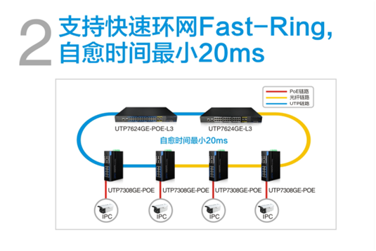 產(chǎn)品支持快速環(huán)網(wǎng)fast-ring,系統(tǒng)自愈時(shí)間最小為20ms,有效應(yīng)對(duì)網(wǎng)絡(luò)傳輸過程中的斷網(wǎng)問題,確保系統(tǒng)的穩(wěn)定可靠,保障網(wǎng)絡(luò)數(shù)據(jù)傳輸安全。