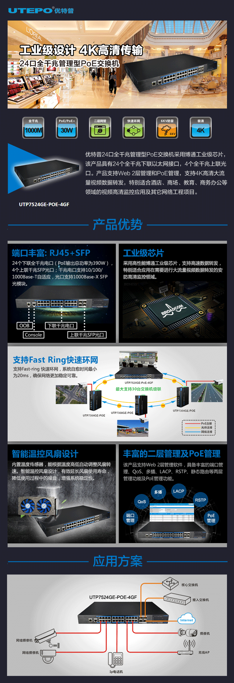 優(yōu)特普24口全千兆管理型PoE交換機(jī)采用博通工業(yè)級(jí)芯片,該產(chǎn)品具有24個(gè)全千兆下聯(lián)以太網(wǎng)接口,4個(gè)全千兆上聯(lián)光口。產(chǎn)品支持Web 2層管理和PoE管理,支持4K高清大流量視頻數(shù)據(jù)轉(zhuǎn)發(fā),特別適合酒店、商場(chǎng)、教育、商務(wù)辦公等領(lǐng)域的視頻高清監(jiān)控應(yīng)用及其它網(wǎng)絡(luò)工程項(xiàng)目。