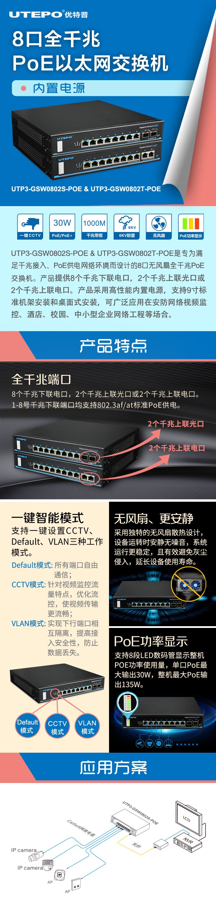 UTP3-GSW0802S-POE/UTP3-GSW0802T-POE是專為滿足千兆接入、PoE供電網(wǎng)絡環(huán)境而設計的8口無風扇全千兆PoE交換機。產(chǎn)品提供8個千兆下聯(lián)電口,2個千兆上聯(lián)光口或2個千兆上聯(lián)電口。產(chǎn)品采用高性能內(nèi)置電源,支持9寸標準機架安裝和桌面式安裝,可廣泛應用在安防網(wǎng)絡視頻監(jiān)控、酒店、校園、中小型企業(yè)網(wǎng)絡工程等場合。