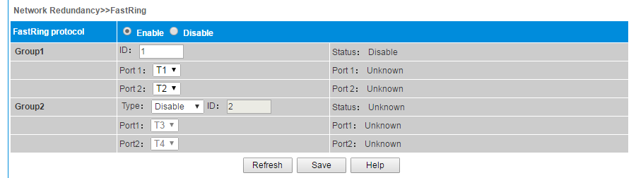 第三部,打開Network Redundancy下的Fast Ring頁面,根據(jù)連接方案選擇Group1或Group2設(shè)置,保存;
