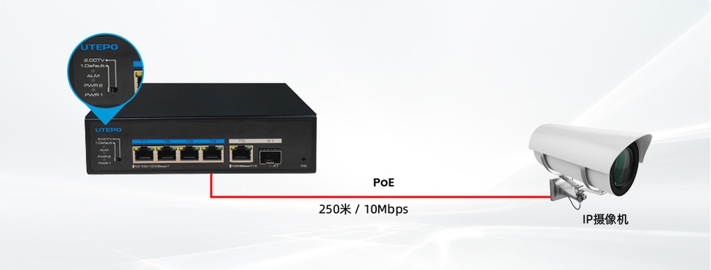 用戶可通過面板上的撥碼開關(guān)切換交換機(jī)的工作模式,在CCTV模式下,優(yōu)特普交換機(jī)的下聯(lián)端口最遠(yuǎn)傳輸距離延長(zhǎng)至250米 (速率降為 10M)。