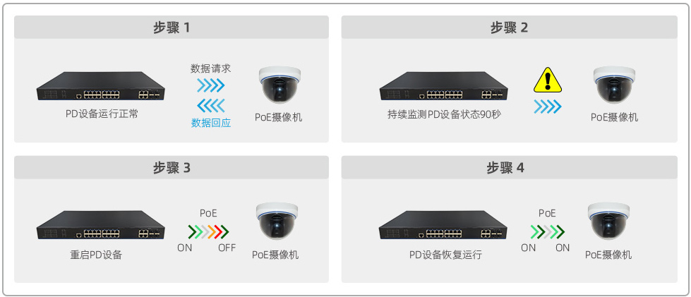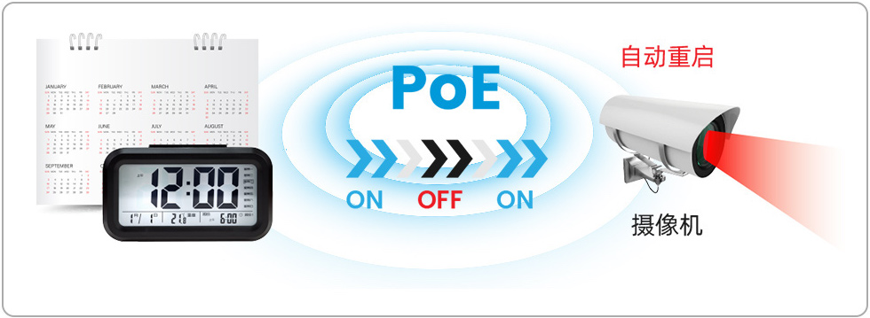 支持PoE Watchdog(看門狗)功能,實(shí)現(xiàn)PoE攝像機(jī)掉線自動偵測、自動重啟,減少系統(tǒng)維護(hù)成本。