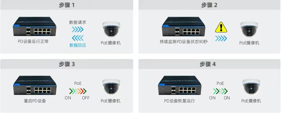 支持IEEE 802.3af/at標(biāo)準(zhǔn)POE供電,支持POE Watchdog( 看門狗)功能,實(shí)現(xiàn)POE攝像機(jī)掉線自動偵測、自動重啟,減少系統(tǒng)維護(hù)成本。