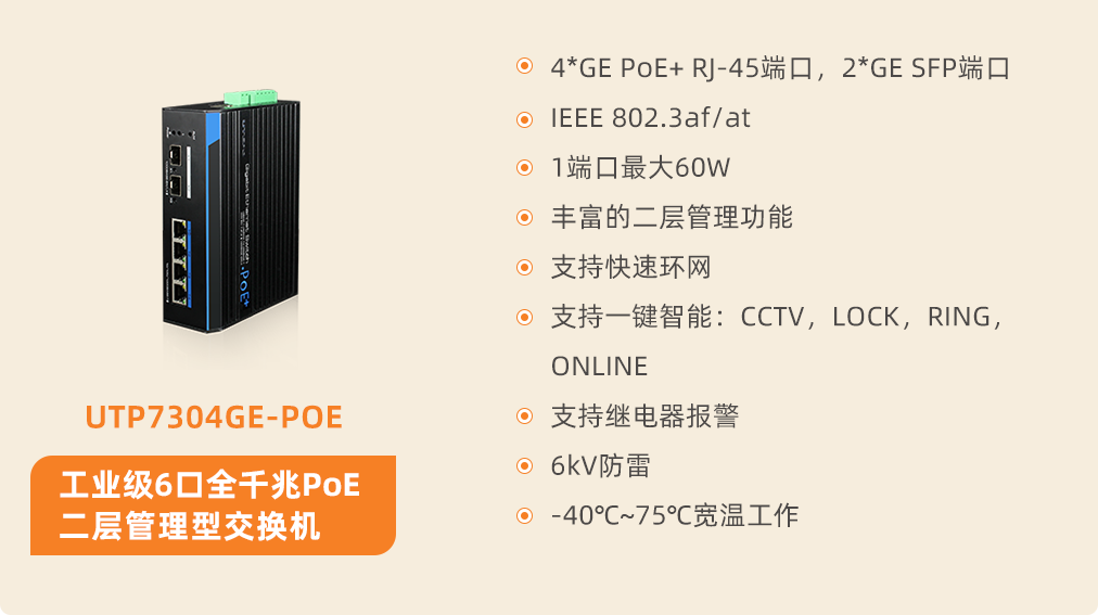 接入層部署了優(yōu)特普工業(yè)級L2管理型交換機(jī)UTP7308GE-POE和UTP7304GE-POE,用以連接高清攝像頭,實(shí)時監(jiān)控周圍環(huán)境變化,并傳輸高清視頻數(shù)據(jù),為運(yùn)維人員提供準(zhǔn)確的數(shù)據(jù)支持。優(yōu)特普16/24端口L2管理型PoE交換機(jī)(UTP7516GE-POE-4GF、UTP7524GE-POE-4GF)部署在匯聚層,將接入層采集的大流量數(shù)據(jù)高速轉(zhuǎn)發(fā)至核心層。