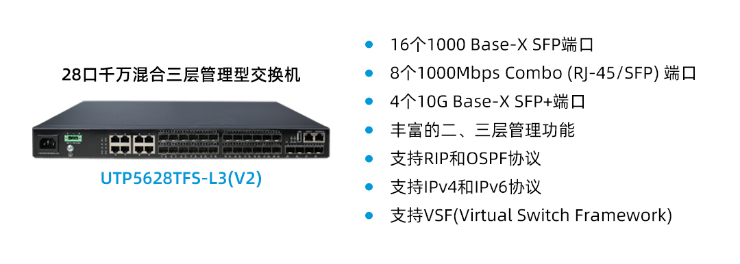 ● 中端匯聚:采用優(yōu)特普28口千萬(wàn)混合三層管理型交機(jī) UTP5628TFS-L3(V2) ,利用二層、三層網(wǎng)絡(luò)技術(shù)及虛擬化技術(shù)對(duì)多業(yè)務(wù)數(shù)據(jù)進(jìn)行安全隔離,按優(yōu)先級(jí)處理,及時(shí)有效地發(fā)現(xiàn)應(yīng)對(duì)網(wǎng)絡(luò)中的異常攻擊流量,提升網(wǎng)絡(luò)可靠性。