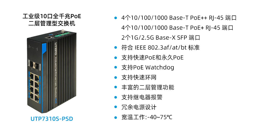 ● 前端接入:采用優(yōu)特普工業(yè)級(jí)10口全千兆PoE二層管理型交換機(jī) UTP7310S-PSD,單口最大支持90W的PoE功率,可滿足智能樓宇中高耗電IP設(shè)備的供電需求,為LED照明系統(tǒng)(室內(nèi)和室外)、網(wǎng)絡(luò)系統(tǒng)(AP、路由器、PC)、安全系統(tǒng)(門(mén)禁、網(wǎng)絡(luò)攝像機(jī)、云臺(tái)攝像機(jī))、傳感器等終端設(shè)備提供穩(wěn)定可靠的網(wǎng)絡(luò)傳輸和PoE供電。