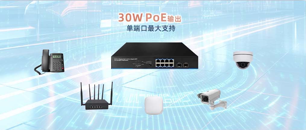 提供PoE供電功能,符合IEEE 802.3af/at PoE標準,單個端口最大支持30W的PoE輸出,可為無線接入點、網(wǎng)關、IP電話、監(jiān)控攝像頭等設備提供穩(wěn)定的電源。