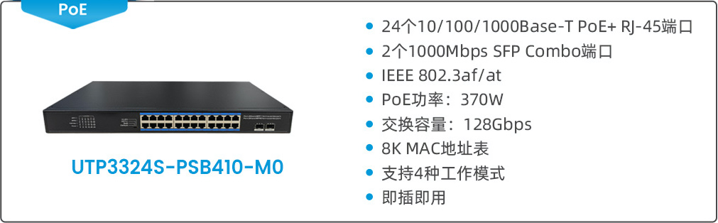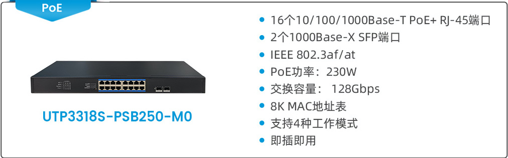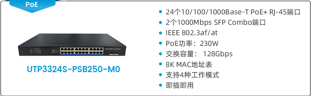 UTP3318-PSB250-M0的9-14下聯(lián)端口速率降為10Mbps,最遠(yuǎn)傳輸距離延長(zhǎng)至250米。UTP3324S-PSB250-M0, UTP3324S-PSB410-M0的17-22下聯(lián)端口速率降為10Mbps,最遠(yuǎn)傳輸距離延長(zhǎng)至250米。