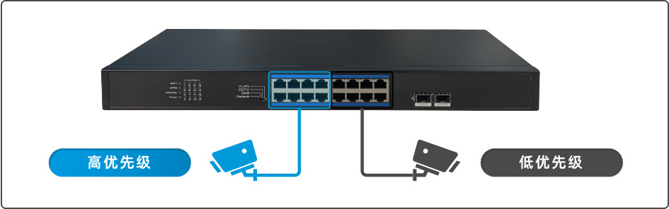 交換機(jī)的1-8端口為高優(yōu)先級(jí)端口。當(dāng)交換機(jī)轉(zhuǎn)發(fā)的數(shù)據(jù)發(fā)生擁堵時(shí),高優(yōu)先級(jí)端口上的數(shù)據(jù)將被首先轉(zhuǎn)發(fā)出去,從而保證了關(guān)鍵位置的視頻和數(shù)據(jù)的穩(wěn)定傳輸,不會(huì)出現(xiàn)中斷或滯后。