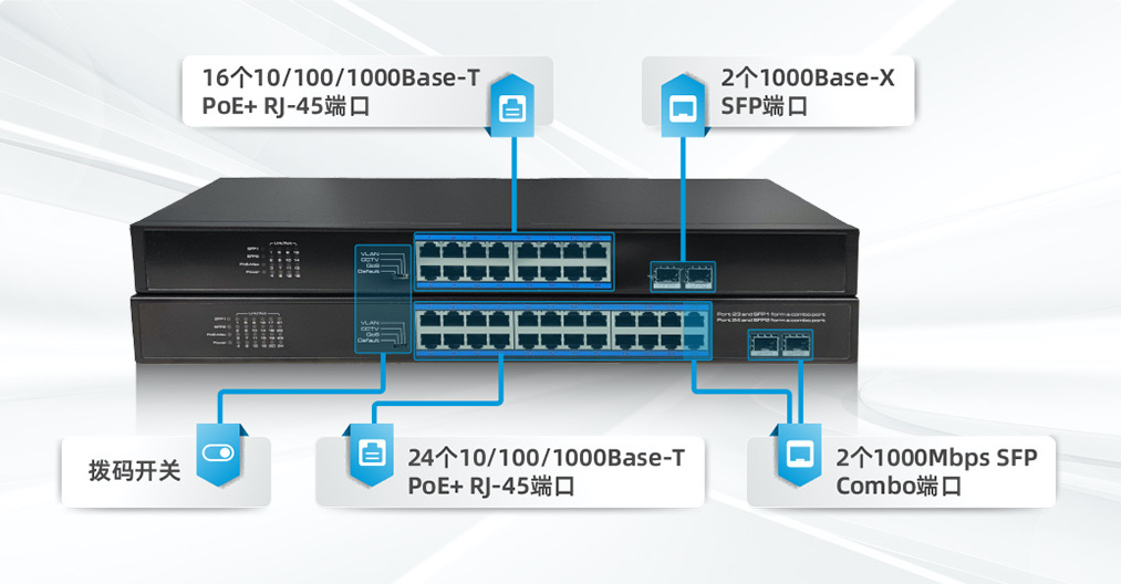 提供16/24個(gè)10/100/1000Base-T PoE供電端口,單端口支持最大30W的PoE功率,通過一根網(wǎng)線,可同時(shí)給IP攝像機(jī)、AP等設(shè)備提供電源和數(shù)據(jù)傳輸。