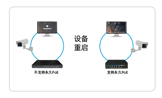 永久PoE技術,當PoE交換機重啟時,永久PoE技術能為所連接的PD設備(PoE攝像機等)提供不間斷的電源。