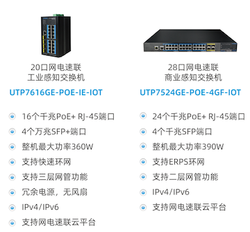 優(yōu)特普提供多端口匯聚、核心交換機,產品支持豐富的二層、三層網管功能,在可用性、可擴展性和安全性方面具有良好優(yōu)勢。搭配可視化運維綜合管理平臺(網電速聯(lián)云平臺),網絡管理員可對交換機、網關、攝像機、傳感器、智慧桿等物聯(lián)設備的網、電數據進行全方位管理。