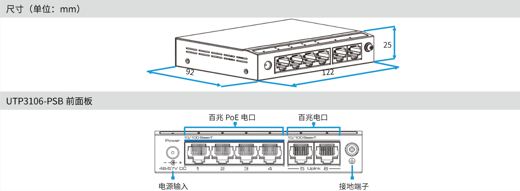 UTP3106-PSB、UTP3106-PSD交換機可提供4個百兆RJ-45以太網(wǎng)端口,2個百兆上聯(lián)RJ-45以太網(wǎng)端口。UTP3210-PSD交換機可提供8個百兆RJ-45以太網(wǎng)端口,2個千兆上聯(lián)RJ-45以太網(wǎng)端口。所有下聯(lián)RJ-45端口均支持以太網(wǎng)供電(PoE)。UTP3106-PSB交換機1~4端口單口提供最大30W的功率。UTP3106-PSD交換機1端口提供最大90W的功率,2~4端口單口提供最大45W的功率。UTP3210-PSD交換機每個端口可提供最大45W的功率,可通過撥碼開關(guān)設(shè)置為1端口提供最大 90W的功率,同時2端口關(guān)閉PoE功能,3~8端口單口提供最大45W的功率。