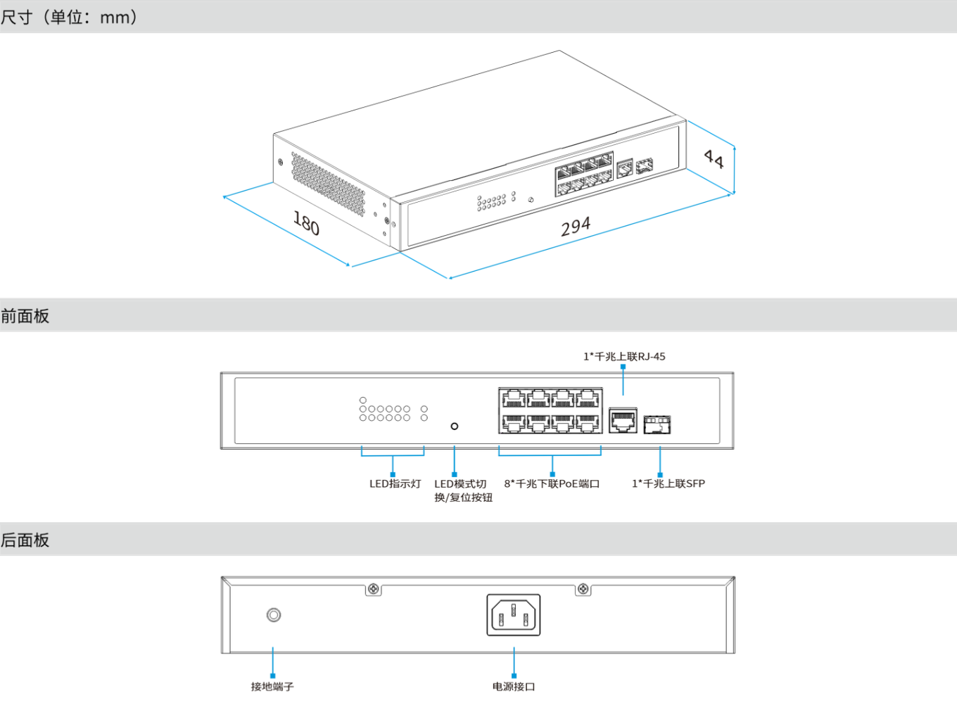 ● 8*10/100/1000Base-T PoE+RJ-45 端口
